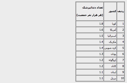 کشورهایی که در جدول زیر آمدهاند دارای بالاترین تعداد دندانپزشک نسبت به جمعیت هستند