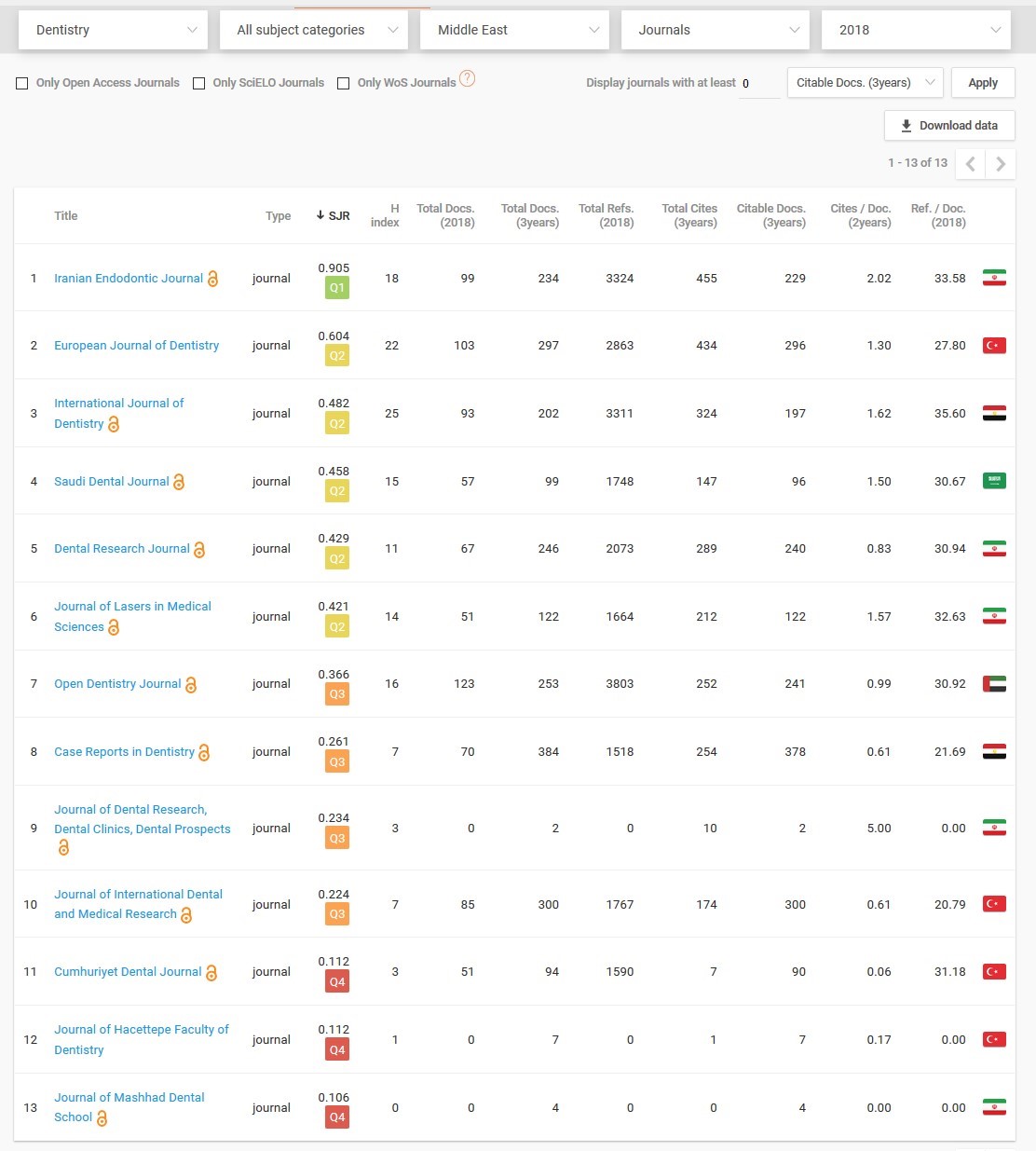 همچنین لازم به ذکر است که بر اساس استنادات همین پایگاه داده ای، هم اکنون در منطقه خاورمیانه تعداد ۸۲۰ مجله در تمام حوزه های علمی تحت پوشش اسکوپوس (نظیر پزشکی، دندانپزشکی، داروسازی، اقتصاد، کامپیوتر، شیمی، بازرگانی و …) منتشر می شوند. با لحاظ شاخص SJR که شاخص اصلی در نظام رتبه بندی این پایگاه داده ای است در بین اسامی ۵۰ مجله علمی برتر منطقه خاورمیانه، کشور مصر به شکل بلامنازعی صدر نشین رتبه های برتر است و در این میان انچه بسیار جلب توجه می نماید این است که در میان ۵۰ مجله برتر علمی منطقه، پرچم کشور هایی نظیر ایران، ترکیه وعربستان سعودی فقط یکبار به چشم می خورند. البته نکتهای که باید با کمال افتخار اعلام نمود این است که رتبه ۲۹ این لیست که با پرچم کشور عزیزمان مزین شده متعلق است به مجله اندودانتیکس ایران (Iranian Endodontic Journal) و این افتخاری است برای همه اندودانتیستهای عزیز کشور و مرکز تحقیقات و پژوهشکده علوم دندانپزشکی شهید بهشتی. اما نکته بسیار پر اهمیت تر این است که که هم اکنون در میان مجلات دندانپزشکی خاورمیانه، مجله Iranian Endodontic Journal برای اولین بار و به صورت همزمان، هم در جایگاه اول منطقه قرار گرفته و هم تنها مجله Q1 در حوزه علوم دندانپزشکی در منطقه خاور میانه است که از این دومنظر می بایست ضمن شکرگذاری به درگاه ایزد منان، به عنوان مدیر مسول این مجله از تمامی دستاندرکان این ژورنال علمی تشکر نمایم.