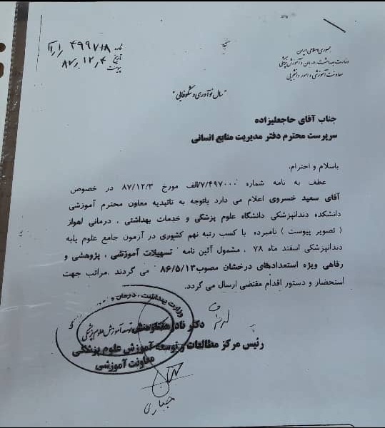 من به دلیل کسب رتبه نهم کشوری در آزمون علوم پایه دندانپزشکی سال ۷۸، مشمول آئیننامه تسهیلات آموزشی استعدادهای درخشان شدم و استریت بودم؛ اما به دلیل شرایط خاص خانوادگیام، نتوانستم تخصص بخوانم. چرا که پدر من به دلیل حادثهای برای ایشان پیشآمده بود دچار ضایعه نخاعی شدید شده است و خواهرم معلول ذهنی متوسط است و من باید از خانواده حمایت میکردم.