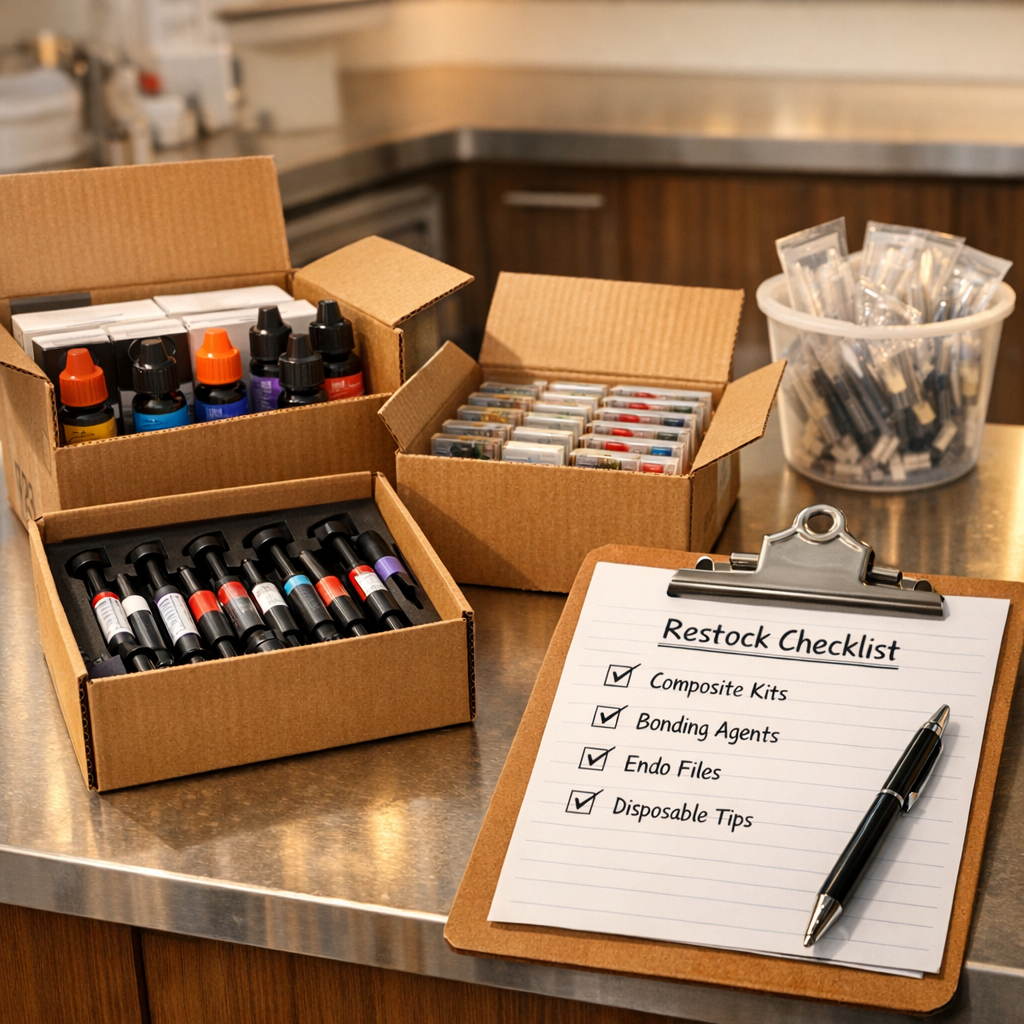 لیست مواد مصرفی (کامپوزیت، باندینگ، فایل روتاری) را چک کنید.