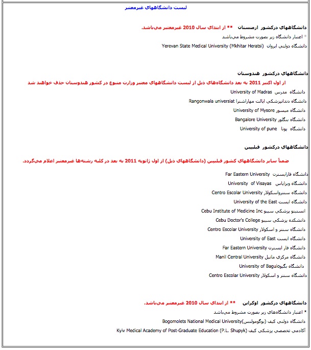 در این سالها بر اساس گزارش بازدیدهای مسئولان دولتی، نمایندگان مجلس، رایزنهای علمی و فرهنگی و بررسی وضعیت دانش آموختگان برخی از دانشگاههای خارجی نشان داد که این دانشگاهها از کیفیت لازم آموزشی لازم برخوردار نبودهاند. از همین رو از آگوست ۲۰۰۹ وزارت بهداشت چندین دانشگاه را در ۹ کشور غیر معتبر اعلام کرد.