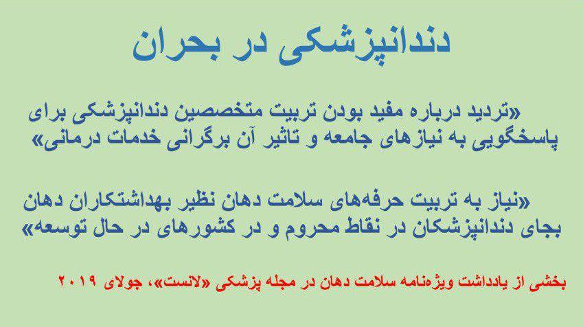 مجله لانست، از مهمترین مجلات پزشکی جهان، در شماره ژوئیه۲۰۱۹ ویژه‌نامه‌ای درباره سلامت دهان منتشر کرده است. در یکی از مقالات، نویسندگان که از شناخته شده‌ترین صاحبان کرسی‌های علوم سلامت و دندانپزشکی هستند خواستار تغییرات بنیادین در دندانپزشکی شده‌اند.
